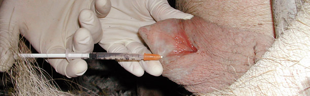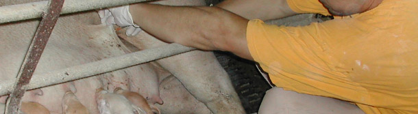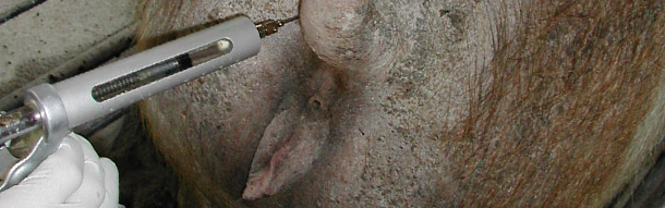 對于全面免疫,我們使用普通的自動注射槍,它外帶有延伸的一次性針管,注射后肢肌肉群。(當針管刺入母豬時,有必要引導母豬,否則針管會無法注射)。