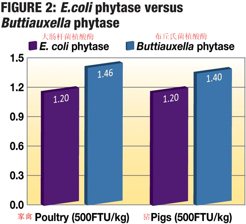 一種新式布丘氏植酸酶,表現出超越現有大腸桿菌植酸酶的好處,這是這個領域中最近的發展成果。圖2展示了飼料添加量為500 FTU / kg的相對速效磷排放量(g/ kg飼料)。