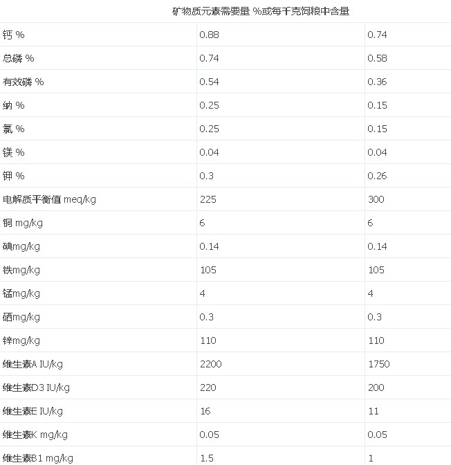 豬可以通過增加或減少采食量來適應飼糧濃度的變化(Hardy,1972),而林映才和蔣宗勇(2000d)研究表明,早期斷奶仔豬對消化能攝入量的調節能力較差,能量攝入量影響其生產性能和胭體品質。同時發現,早期斷奶仔豬對干物質、氮、粗脂肪和能量的消化率依飼糧消化能濃度的遞增而提高,最適消化能攝入量為4349kJ/d。因此早期斷奶仔豬飼糧消化能濃度應適當提高。NRC(1998)以不同的體重函數估測仔豬消化能攝入量,但與國內研究結果有一定差距,可能是豬種或環境因素所致。NRC(1998)根據指數方程預測礦物元素及維生素需要量。林映才和蔣宗勇(1999;2000)以生長性能、單位體重脫脂干股骨重、骨中灰分、鈣、磷量、血清鈣及無機磷濃度為指標,得到4一9kg杜x(大x長)斷奶仔豬鈣、有效磷需求參數分別為0.90%和055%(總磷0.75%),鈣總磷比為1.2:l;鈣有效磷比為1.64:1。