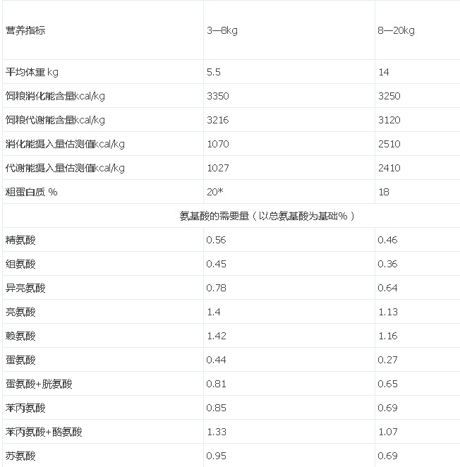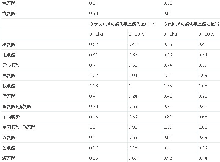 NRC(1998)對5一l0kg仔豬的玉米一豆粕型飼糧的粗蛋白質水平的推薦量為23.7%,并認為在仔豬采食血漿蛋白粉、乳清粉、乳糖等動物來源的蛋白質時,其推薦量為20.7%一21.7%。在選用蛋白源時,要考慮蛋白質的消化率、氨基酸平衡及適口性是否能夠為仔豬提供免疫保護(Toacher,1998)。NRC估測仔豬氨基酸需要量是先根據體重函數的回歸方程預測第一限制性氨基酸(賴氨酸)需要量,再根據理想蛋白質模式估測其它必需氨基酸的需要量,但對于不同日齡斷奶的仔豬,這種比例并不一致,其需要量應該是不同的。林映才和蔣宗勇(2000b;c;2001)以生產性能和血清尿素氮為指標,估測3一8kg杜x(大x長)斷奶仔豬粗蛋白質、總賴氨酸、總蛋氨酸、總蘇氨酸、總色氨酸的需要量分別為20%、1.45%、0.44%、0.985%、0.28%,以此得到理想蛋白質模式,賴:蛋:蘇:色氨酸比例為100:30:68:19。Owen等1995報道,早期隔離斷奶仔豬的賴氨酸需要量為1.65%—1.8%,Peter.K(2004)試驗表明,滿足斷奶仔豬最大生長速率的可消化纈氨酸需要量為0.599/MJME,而NRe(1995)推薦量為0.469/MJME。通常賴氨酸、蛋氨酸、蘇氨酸、色氨酸、異亮氨酸都是斷奶仔豬所缺乏的,最近研究發現谷氨酸缺乏是引起腸黏膜萎縮的主要原因,即谷氨酸對斷奶后的腸黏膜具有一定的修復作用(Thaeker,1995)。廣東省農科院畜牧所采用梯度試驗系統了3一8kg及8一20kg杜x(大x長)斷奶仔豬能量、粗蛋白質、賴氨酸、蛋氨酸、蘇氨酸、色氨酸等必需氨基酸、以及鈣、磷、電解質平衡等營養需求參數,并作為我國豬飼養標準修訂組參加單位提出集約化飼養瘦肉型仔豬的營養需要量(見表2)。