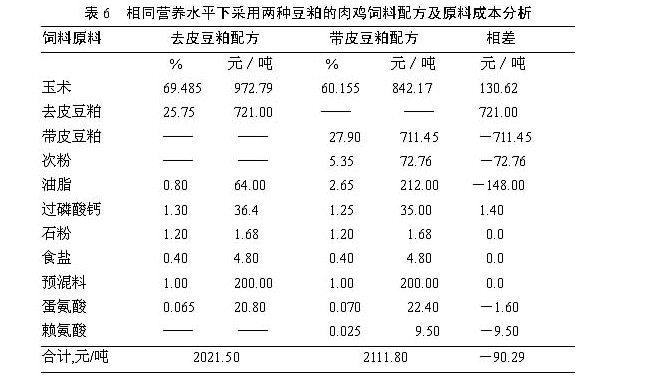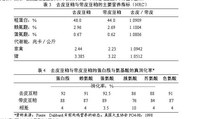 豆皮的主要組分是細胞壁或植物纖維,不能或很難被雞、豬等單胃動物消化吸收;但可通過瘤胃微生物很好地為反芻動物所利用。豆皮的產奶凈能介于玉米和麩皮之間,由于其能量來源是易消化纖維而不是淀粉,所以不存在玉米等谷物飼料抑制瘤胃纖維降解的負互作效應(Negative Associate Effect)。用豆皮取代奶牛日糧中的部分精飼料,可以減少因飼喂高精料日糧導致的種種代謝病,提高日糧中粗飼料的纖維降解率。在大豆加工過程中把豆皮與子葉分開,飼喂不同動物,做到了各得其所,各盡其用。 圖1所示為去皮浸出法加工大豆的一般工藝流程。清理過的大豆先經初步干燥(降低水分1-2個百分單位)或適度加熱(20-30分鐘緩慢加熱至60℃,然后迅速加熱至85℃),使豆皮與子葉易于分開,再經破粒、風選,分離豆皮。去了皮的子葉經保溫軟化、壓片后,即進入溶劑浸出過程。浸出豆油后,還需經過進 一步加熱,以排除殘留溶劑并鈍化抗胰蛋白酶等影響豆粕利用的有害因子。豆粕加熱程度的掌握至關重要。加工供單胃動物用的豆粕,一般用直接蒸汽在設定的溫度、水分、時間條件下常壓蒸煮,再經干燥冷卻。該工藝可有效地破壞抗胰蛋白酶等有害因子,同時最大限度地保持賴氨酸的有效性,比之傳統的加熱處理方法所生 產的豆粕質量高而穩定。用上述工藝生產的去皮豆粕,其尿酶活性(評價加熱不足的指標,超過0.3表明加熱不足)可接近于零,而KOH溶解度(評價加熱過度的指標,低于70%表明加熱過度)可高達85%以上。 如用戶要求含44%蛋白的“普通”豆粕,加工廠需將豆皮加熱、粉碎后,按比例 重新搭配到去皮豆粕中,并混合均勻。因此,對于現代化的去皮浸出工藝來說,帶皮的“普通”豆粕并不普通,而是經過再加工的產品。為此,本文中將使用“帶皮豆粕”一詞來表達不去皮加工的產品或去皮制油后又重新將豆皮粉碎、混入去皮豆粕的產品。 去皮豆粕的質量標準、營養價值及價格 表2所列為美國“全國油料籽加工者協會”(Nationa1 Oi1seed Processors Association,簡稱NOPA)制訂的帶皮豆粕與去皮豆粕的質量標準。去皮豆粕的平均蛋白含量為48%,但由于大豆本身的蛋白含量受品種和環境,特別是氣候的影響(例如美國中西部和西北部所產大豆的蛋白含量一般比南部所產大豆低),去皮豆粕的蛋白含量也相應地有所變化NOPA規定去皮豆粕的蛋白含 量標準由買賣雙方商定。這一原則也適用于粗纖維的含量標準。大豆本身的蛋白含量的差異導致的豆粕蛋白含量的差異,有時會使人難以用蛋白含量來絕對地區分去皮豆粕和帶皮豆粕。例如,印度帶皮豆粕蛋白含量可高達46%以上,而產于北方冷涼地區的去皮豆粕的蛋白含量有可能不超過47%。二者盡管蛋白含量接近,代 謝能含量卻相差很大,而且由于加工工藝和質量控制水平不同,氨基酸特別是賴氨酸的有效性也會有很大不同。用粗纖維含量的差異來區分兩種豆粕,似更為妥當。 從動物營養角度來看,除蛋白質以外,代謝能、必需氨基酸特別是賴氨酸和蛋氨酸(第一與第二限制氨基酸)的含量是重要的指標。表3是美國國家研究委員會 (NRC)發表的去皮豆粕與帶皮豆粕的主要營養指標以及據此計算出去皮豆粕與帶皮豆粕的各項營養成分的比值。值得注意的是,對于家禽來說,去皮豆粕的代謝能比帶皮豆粕高出9.4%;而對于豬來說,則只高出5.1%。以上資料中并未包括蛋白質、氨基酸的可消化率或可利用率。根據羅納普朗克動物營養公司 (Rhone-Poulenc Animal Nutrition)的資料,去皮豆粕的蛋白質、賴氨酸及其他幾種主要氨基酸的真消化率均明顯高于帶皮豆粕(表4)。 去皮豆粕與帶 皮豆粕的價格比,基本上反映二者的蛋白含量比,在美國大致變動在1.065-1.085之間。在中國,進口去皮豆粕與市場上帶皮豆粕的價格比可達1.09 -1.10。如果把運費考慮在內,由美國進口去皮豆粕與由美國進口帶皮豆粕的價格比,比美國國內的價格比本應還低一些。中國市場兩種豆粕的比價偏高主要是 由于美國進口豆粕與中國自產豆粕或印度、南美進口豆粕的差價所造成的。 按豆皮占原料大豆的8%、毛油出率占原料大豆的18%計,去 皮豆粕產量相當于帶皮豆粕產量的90.2%(74/82),豆皮產量占帶皮豆粕產量的9.8%(8/82)。如果去皮豆粕的價格是帶皮豆粕價格的1.08 倍,從去皮豆粕可回收帶皮豆粕市場售價的97.4%(90.2%×1.08);如果去皮豆粕的價格是帶皮豆粕價格的1.10倍,從去皮豆粕可回收帶皮豆粕 市場售價的99.2%(90.2%×1.1)。由此推算豆皮的最低售價,在上述兩個價格比的條件下,分別為帶皮豆粕售價的26.5%(2.6% /9.8%)與8.1%(0.8%/9.8%)。美國市場一般情況下,玉米價格是豆粕價格的40-50%,豆皮的價格是玉米價格的65%。據此推算,豆皮 的市場價格為豆粕的26%(0.65×0.4)-32.5%(0.65×0.5)。考慮到粉碎豆皮與重新攙混的再加工費用,對于采用去皮浸出工藝的大豆加工廠來說,分別出售去皮豆粕和豆皮也是合算的。 如果從單項營養成分蛋白、代謝能、賴氨酸、蛋氨酸來比較(表3),去皮豆粕與帶皮豆粕的價格比達到1.10時,購買去皮豆粕似乎未必合算。然而,去皮豆粕在配合飼料中的實際價值,只有在電腦配方中才顯示出來。 去皮豆粕在飼料配方中的作用及其實際價值 我們先以生長肉雞配方為例,說明去皮豆粕在飼料配方中的作用及其實際價值。假定可供肉雞飼料配方選擇的飼料原料的營養成分與價格如表5所示。本例中采用 的是當時市場