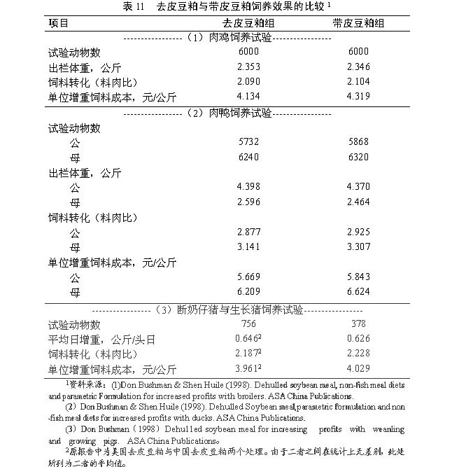 應當指出,以上對有關去皮豆粕的價值的分析是相當保守的。這是因為筆者并未將氨基酸的可消化性或有效性(表4)考慮在內。其次,對用現代制油技術所生產的去皮豆粕質量的高度穩定性這一優勢也未包括在內。 最后,去皮豆粕對飼料加工所能帶來的效益也不應忽視。例如,前面所舉的肉雞帶皮豆粕配方中的油脂添加量達到了2.65%(表6)。這在一般的制粒設備、 工藝條件下,往往會導致顆粒飼料的質量(穩定度,durabililty)下降。而去皮豆粕配方中只含0.8%的外加油脂(表6),在相同條件下,將會制成質量(穩定度)比帶皮豆粕配方為高的顆粒飼料。此外,當要求飼料粉碎粒度很細的情況下,例如在加工擠壓熟化的魚飼料或寵物飼料時,粉碎去皮豆粕的電耗將 明顯低于帶皮豆粕。 飼養試驗結果 1997年,美國大豆協會以肉雞、鴨和豬為對象動物,對去皮豆粕和帶皮豆粕在生產條件下進行了對比飼養試驗。在這批試驗中,去皮豆粕的蛋白含量定為47%,帶皮豆粕蛋白含量定為44%。去皮豆粕與帶皮豆粕的價格比按蛋白含量比設定為 1.068。帶皮豆粕配方為現用配方(對照)。去皮豆粕配方與對照配方唯一不同之處為按一定的氨基酸/代謝能比調整玉米與豆粕在配方中的比例。由于去皮豆粕的蛋白、氨基酸和代謝能的含量比帶皮豆粕高,豆粕在配方中的用量比對照配方相應減少,玉米用量相對增高,從而導致去皮豆粕配方的能量濃度比對照高出 0.1兆卡/公斤左右。至于飼料成本,在試驗當時所設定的價格關系下,去皮豆粕配方反而比對照稍低。表11簡要歸納了上述試驗結果。 參試肉雞共12,000只。結果表明,去皮豆粕日糧組的出欄體重提高了0.3%[(2.353-2.346)/2.346],每公斤增重的飼料消耗降低了0.7%[(2.104-2.09)/2.104],每公斤增重的飼料費用降低了4.3%[4.319-4.134]/4.319]。總數為24160 只肉鴨的飼養試驗結果表明,去皮豆粕組的出欄體重,公鴨提高了6.4%,母鴨提高了5.4%;每公斤增重的飼料消耗,公鴨降低了1.6%,母鴨降低了 5.0%;每公斤增重的飼料費公鴨降低了3.0%,母鴨降低了6.3%。豬的飼養試驗(總頭數1134)結果是,去皮豆粕日糧組的日增重提高了3.2%, 每公斤增重的飼料消耗降低了1.8%,每公斤增重的飼料費用降低了1.7%。三種動物、三批試驗的結果完全一致。 上述試驗的去皮豆 粕的相對價格是按兩種豆粕的蛋白含量關系確定的。按此價格關系計算的飼料原料成本,能量和其他營養水平高的去皮豆粕配方反而略低于帶皮豆粕配方。由于目前國內市場上去皮與帶皮豆粕的價格比有可能超過蛋白含量比,同樣的去皮豆粕配方的飼料原料成本有可能不低于,甚至略高于相應的帶皮豆粕配方。然而,只要去皮 豆粕在配方中的實際價格或影子價格高于市場價格,就一定能用去皮豆粕配成營養水平比相應的帶皮豆粕配方高而飼料原料成本相同的飼料。相同的飼料原料成本,更高的營養水平,這是去皮豆粕在飼料配方中可以發揮的另一優勢。(選自飼料工業,作者:熊易強 博士,美國大豆協會) |