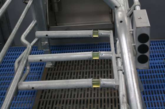 產(chǎn)仔圈的設(shè)計(jì)是Balance Frame的概念,這是一種Nooyen地板系統(tǒng)的創(chuàng)新。該系統(tǒng)可防止母豬突然準(zhǔn)備躺臥時(shí)壓迫新生仔豬。當(dāng)母豬站起時(shí),她的背接觸傳感器,激活升降器,可有效地將母豬的地面提升,高出仔豬的地面幾厘米。這樣,仔豬無(wú)法進(jìn)入母豬的地帶。而母豬躺下時(shí),該系統(tǒng)與則執(zhí)行相反的功能,并會(huì)降低母豬的地面,允許仔豬吮奶。