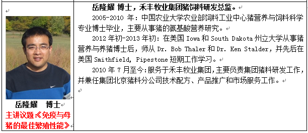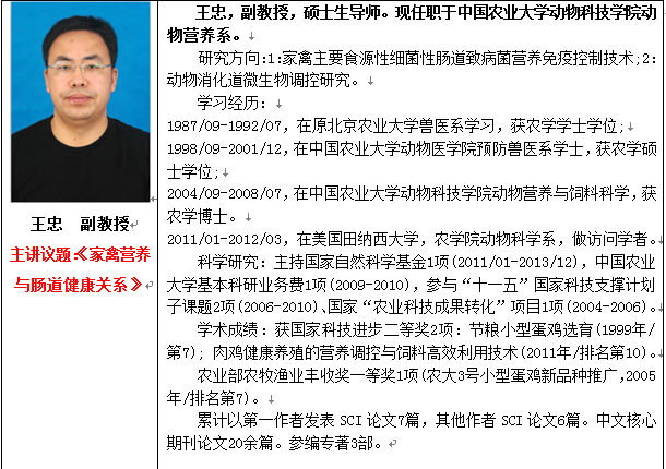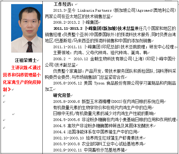 尊敬的各企事業(yè)單位領導、各位同行: 您好! 歷時數(shù)十年,畜牧業(yè)在我國迅速崛起,并取得了驕人的成績。但是,隨著養(yǎng)殖環(huán)境日趨惡化,畜禽疾病頻繁爆發(fā): 2000年的藍耳病,2001年的圓環(huán)病毒,2002年的呼吸道綜合征……到2013年的“死豬事件”、“H7N9”等問題逐漸成為困擾我們畜牧人的難題。 如何才能找到一個安全、有效的方式解決這些問題來實現(xiàn)綠色健康養(yǎng)殖?俗話說:“動物最好的醫(yī)生是自己體內(nèi)的免疫系統(tǒng)!”當免疫系統(tǒng)正常運作的時候,它扮演一個強大的防線,能有效抵抗大多數(shù)的疾病;同時,營養(yǎng)與免疫系統(tǒng)存在非常密切的關系,動物的營養(yǎng)狀況影響著機體的免疫功能和對疾病的抵抗力。 由此可見,免疫營養(yǎng)在動物健康養(yǎng)殖中起著巨大作用。那么,怎么從營養(yǎng)的角度提高動物免疫力和抗病力,從而實現(xiàn)健康養(yǎng)殖,生產(chǎn)綠色安全動物產(chǎn)品來保證養(yǎng)殖業(yè)可持續(xù)發(fā)展?是行業(yè)內(nèi)關注的焦點并急切解決的問題。 繼成功舉辦“中國抗病營養(yǎng)理論與新技術高峰論壇”和“國際母仔豬營養(yǎng)與飼養(yǎng)管理高峰論壇”后,應廣大畜牧業(yè)精英的強烈要求,中國飼料行業(yè)信息網(wǎng)將于2014年4月18日正式啟動“動物免疫營養(yǎng)與健康養(yǎng)殖高峰論壇”,屆時,我們將邀請國內(nèi)外動物營養(yǎng)權威專家與畜牧精英共同探討一條更加有效的健康養(yǎng)殖之路,推動中國養(yǎng)殖業(yè)健康發(fā)展! 一、會議名稱:動物免疫營養(yǎng)與健康養(yǎng)殖高峰論壇 二、主辦單位:中國飼料行業(yè)信息網(wǎng) 聯(lián)辦單位:樂斯福飼料添加劑 協(xié)辦單位: 北京中農(nóng)穎泰生物技術有限公司 法國歐密斯公司 美國達農(nóng)威公司 北京科為博生物科技有限公司 美國禮來公司 支持單位:禾豐集團 北京九州互聯(lián)農(nóng)牧有限公司 安佑集團 建明工業(yè)(珠海)有限公司 赤峰和正美化工有限公司 三、會議安排 會議時間:2014年4月18日(全天報告+論壇),17日全天報道。 會議地點:中國.沈陽,香格里拉盛貿(mào)飯店(五星級) 會議規(guī)模:300人左右 參會人員:飼料和養(yǎng)殖企業(yè)領導、技術、采購負責人、貿(mào)易商及飼料添加劑、原料等企業(yè)負責人,高校和科研院所科研人員及研究生。 四、會議日程安排