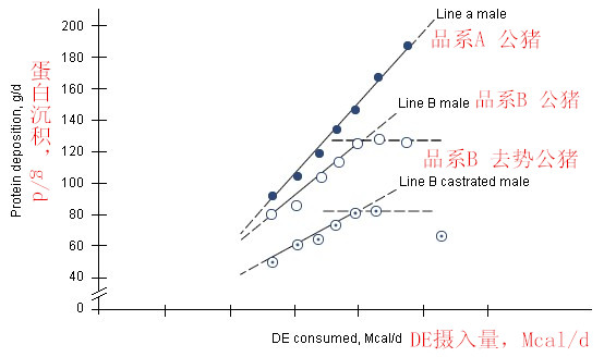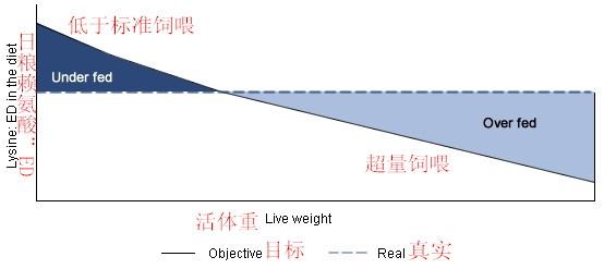 圖1.在堪薩斯州實驗農場,PIC豬的可消化賴氨酸需求模型a a選自Bergstrom等,2009. · 圖2 體重為45-90kg的兩種父系種豬和去勢公豬的能量攝入和蛋白質沉積之間的關系a · a選自Campbell等,1988 ·飼喂階段。育肥豬的營養需求不是一成不變的,也不是僅僅變化2-3次(當我們改變飼料的時候)。在圖3中,如果我們能調整到適合它們的需求狀態時,我們將會節省成本,同時還能確保ADG和FCR。 圖3 日糧中的賴氨酸目標與單個日糧中的賴氨酸水平對比 a選自農業與園藝發展委員會. ·當每天飼喂的賴氨酸量不充分時,我們就會損失ADG和FCR。同樣地,如果我們添加過多賴氨酸,將會增加飼料的成本。 ·性別差異。這個時候還要考慮公母差異。公豬和母豬的生長曲線并不一樣,所以它們的需求也不一樣,當混群飼養時,我們既不要過度飼喂母豬,也不要影響公豬的生長潛力。 ·調整飼喂階段。飼料的營養特征會隨著時間改變。您需要定期與生產商聯系,查看不同生產期正確的飼料供應量。我們尤其要注意仔豬的飼料。不要過多地給飼料,超過它們的需求。按照斷奶仔豬的生長目標,盡可能地為仔豬提供“便宜”的日糧。 ·圖4.堪薩斯州大學建議的斷奶飼料量(kg)a. a選自2007養豬日