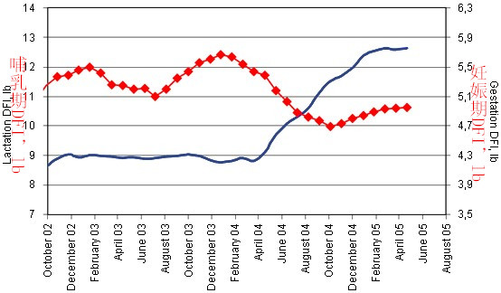 ·妊娠期飼料。有一種廣泛的認識是要過度飼喂妊娠母豬。這不僅會損害生產水平(無乳,哺乳期缺乳,等),也會對飼料成本產生顯著的負面影響,如圖5.