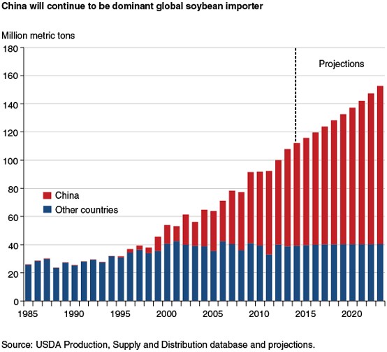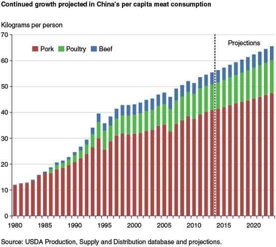 每一年,美國農業部都會預測全球10年內的農產品供給,需求和貿易。在每一個版本中,中國鑒于人口眾多,經濟快速增長,飲食改變,所以被稱為一個關鍵的預測。自20世紀80年代,農業分析師就預測中國將過渡到一個肉類更加豐富的飲食,這已經對世界農產品市場產生了重要的影響。