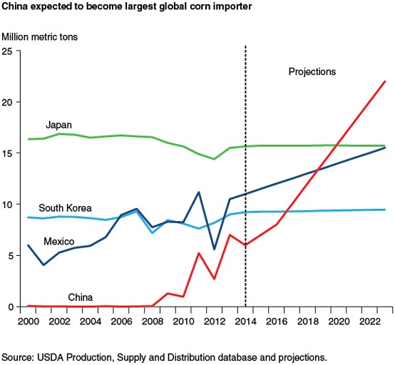 有跡象表明中國對進口糧食的需求來自美國。在2013年,進口糧食增至18mmt。這包括了3mmt美國玉米和4mmt的美國DDGS,DDGS是美國玉米乙醇的副產品,中國家畜養殖者用它當飼料。