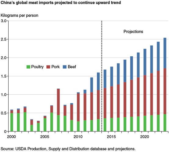 雖然美國農業部項目預測中國的肉類生產正在強勁增長,肉類進口量也預計上升。豬肉進口量預計從750,000萬噸上升到12億公噸。美國,加拿大和歐盟是中國豬肉和種畜的主要供應商。