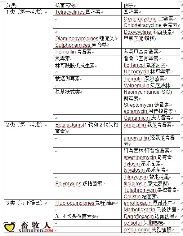 (見表1)第1類抗菌劑的使用方式為標準,負責任的使用準則為“盡可能越少越好,但應該使用就要使用”。這些抗微生物劑被認為是對人類醫學影響最小。依據說明書(產品說明書),除非敏感度測試和/或臨床經驗證明1類抗菌藥物效果不理想或者不可使用的情況下才考慮使用2類抗菌藥物,說明書還應詳細標明藥物如何使用。3類化合物被認為是“不得已使用”的抗菌劑,這可能與人類使用的抗菌藥物相關,因此只能在其他藥物無作用時使用,并要通過敏感性測試。可能的話,它們不應該被用于預防。