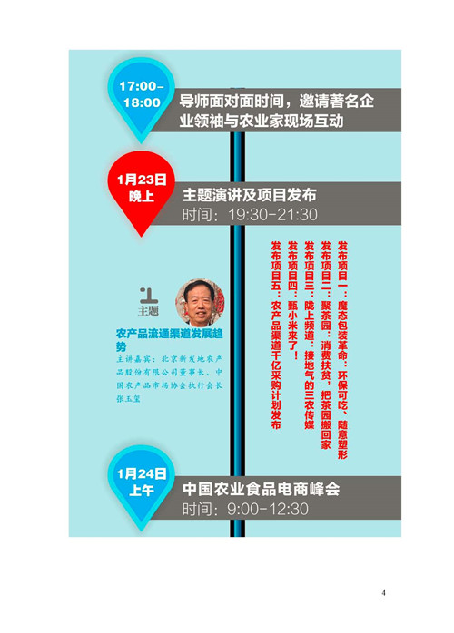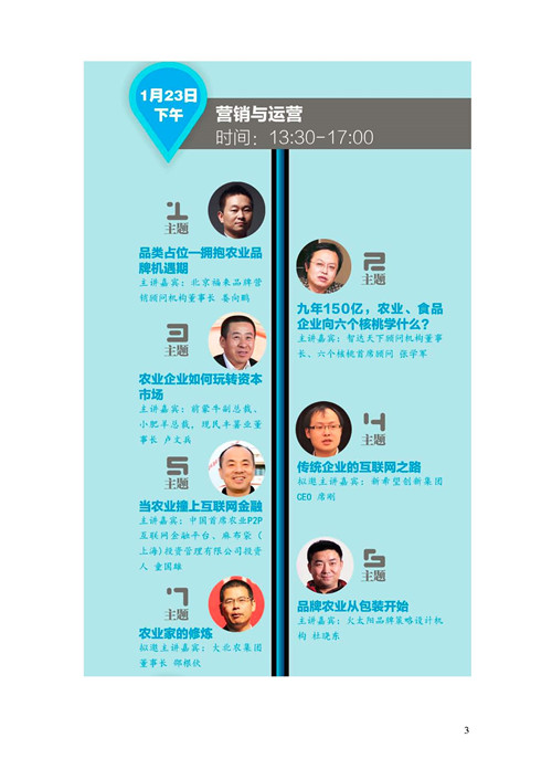 2015中國農(nóng)業(yè)家年會暨首屆中國農(nóng)業(yè)食品電商峰會邀請函 活動名稱 2015‘中國農(nóng)業(yè)家年會暨首屆中國農(nóng)業(yè)食品電商峰會 主辦單位: 中國農(nóng)業(yè)家俱樂部、品牌農(nóng)業(yè)與市場雜志 支持單位 中國食品土畜進(jìn)出口商會 糖煙酒周刊雜志社 中國品牌農(nóng)業(yè)發(fā)展研究院 中國人民大學(xué)農(nóng)業(yè)與農(nóng)村發(fā)展學(xué)院 北京新發(fā)地農(nóng)產(chǎn)品股份有限公司 中國生態(tài)三農(nóng)產(chǎn)業(yè)聯(lián)盟 派代網(wǎng) 活動主題 農(nóng)業(yè)家 創(chuàng)未來 活動宗旨 助力中國農(nóng)業(yè)家群體形成和發(fā)展,加速中國農(nóng)業(yè)現(xiàn)代化進(jìn)程,推廣品牌農(nóng)業(yè)生產(chǎn)經(jīng)營方式,構(gòu)建農(nóng)業(yè)資源配置平臺。 活動時(shí)間 2015年1月22日-24日 活動地點(diǎn) 北京萬達(dá)索菲特大酒店(北京市朝陽區(qū)建國路93號) 主要參會對象 農(nóng)業(yè)主管部門領(lǐng)導(dǎo) 農(nóng)業(yè)企業(yè)董事長、總經(jīng)理 大型農(nóng)業(yè)商業(yè)企業(yè)董事長、總經(jīng)理 農(nóng)業(yè)電商、商超采購負(fù)責(zé)人 農(nóng)業(yè)投資專家、智業(yè)專家 農(nóng)資、農(nóng)業(yè)配套服務(wù)企業(yè)負(fù)責(zé)人 會議議程 1月22日 全天報(bào)到 1月22日 19:00-21:00 中國農(nóng)業(yè)家俱樂部籌備會 2015′中國農(nóng)業(yè)家年會 參會報(bào)名表