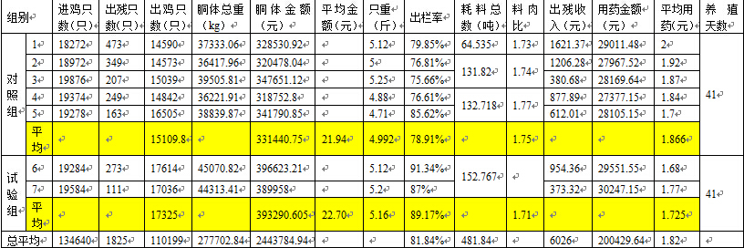 試驗(yàn)材料:試驗(yàn)使用的膽汁酸,由山東龍昌動物保健品有限公司提供。 試驗(yàn)地點(diǎn)與時(shí)間:試驗(yàn)在濰坊安丘一肉雞養(yǎng)殖場進(jìn)行。試驗(yàn)日期為2014年10月17日--11月6日,共21天。 試驗(yàn)動物及分組:養(yǎng)殖場有7個(gè)AA肉雞養(yǎng)殖棚,其中1-5號棚為對照組;6、7號棚為試驗(yàn)組。 試驗(yàn)方法:兩組均選擇21日齡AA肉雞開始試驗(yàn),飼喂相同的飼料,試驗(yàn)組龍昌膽汁酸按150g/T水飲水至試驗(yàn)結(jié)束,對照組空白對照。試驗(yàn)期間,兩組的飼料管理、用藥、免疫等均按養(yǎng)殖場統(tǒng)一要求。 數(shù)據(jù)記錄:詳細(xì)記錄各組AA肉雞進(jìn)雛數(shù)、出欄數(shù)、出欄體重、采食量、死淘數(shù)等。 試驗(yàn)結(jié)果: 結(jié)果分析:從結(jié)果統(tǒng)計(jì)表可以看出,試驗(yàn)組與對照組相比,料肉比降低0.04,出欄率提高10.26%,藥費(fèi)降低0.141元/只,提高經(jīng)濟(jì)效益至少0.9元/只。 討論:膽汁酸是膽汁的主要活性成分,在腸肝循環(huán)中乳化脂肪的同時(shí),與脂肪酸形成脂溶性復(fù)合物,使脂肪酸得以透膜吸收,以完成消化和吸收。由于腸肝循環(huán)不是一個(gè)完全封閉的循環(huán),內(nèi)源性乳化劑、脂肪酶分泌不足就會成為影響飼料脂肪消化吸收的最大因素。 抗生素殺滅細(xì)菌后產(chǎn)生大量的內(nèi)毒素嚴(yán)重影響動物健康,而肝臟在所有營養(yǎng)物質(zhì)的消化吸收、有毒有害物質(zhì)的分解、解毒過程中起非常重要的作用,肝臟病變隨之引起一系列消化吸收障礙,而膽汁酸中的脫氧膽酸能有效分解內(nèi)毒素。脫氧膽酸還可促進(jìn)肝細(xì)胞分泌大量稀薄的膽汁,使膽道暢通,消除膽汁淤滯,起到利膽作用。很多藥物、重金屬、霉菌毒素和其它有害物質(zhì)亦從膽汁中排出,從而維護(hù)動物健康。 綠色提取,健康養(yǎng)殖! |