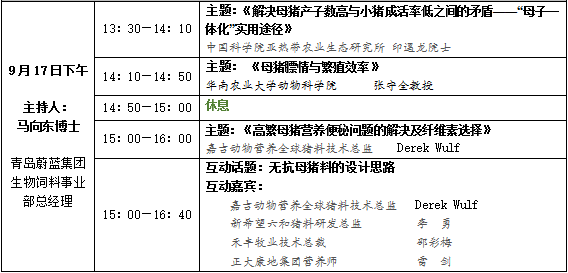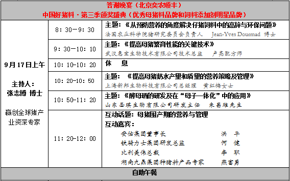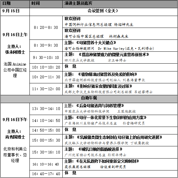 會議主題:第三屆國際母仔豬營養(yǎng)與飼養(yǎng)管理高峰論壇暨中國好豬料·第三季 頒獎盛典 會議時間:2015年9月15—17日 會議地點:中國·廣州華鉅君悅酒店 尊敬的嘉賓: 我們誠摯邀請您參加2015年9月15~17日在廣州華鉅君悅酒店召開的“第三屆國際母仔豬營養(yǎng)與飼養(yǎng)管理高峰論壇”,與學(xué)術(shù)和實戰(zhàn)專家共同探討母子一體化研究進(jìn)展、母豬料研發(fā)技術(shù)、國內(nèi)外先進(jìn)飼養(yǎng)管理技術(shù)等問題。看新常態(tài)下的母仔豬營養(yǎng)和飼養(yǎng)管理技術(shù)將如何蛻變? 看點一:母仔豬營養(yǎng)和飼養(yǎng)管理理論與實戰(zhàn)碰撞,看行業(yè)權(quán)威學(xué)者與實戰(zhàn)專家同臺演繹 看點二:關(guān)注母豬營養(yǎng)熱點探討,看行業(yè)知名飼料企業(yè)技術(shù)總監(jiān)激烈互動 互動論壇一:母豬圍產(chǎn)期的營養(yǎng)與管理 安佑集團(tuán)董事長 洪 平 鐵騎力士集團(tuán)研發(fā)總監(jiān) 何 健 比利美偉總裁 李 職 湖南九鼎集團(tuán)種豬料產(chǎn)品專家 燕富勇 互動論壇二:無抗母豬料的設(shè)計思路 嘉吉全球豬料技術(shù)總監(jiān) Ad van Wesel 新希望六和豬料研發(fā)總監(jiān) 李 勇 禾豐牧業(yè)技術(shù)總裁 邵彩梅 正大康地集團(tuán)營養(yǎng)師 雷 劍 看點三:中國知名、優(yōu)秀母豬料企業(yè)齊聚,觀禮“中國好豬料·第三季頒獎盛典” 看點四:中國綠色飼料添加劑明星品牌同臺,探討減抗、替抗先進(jìn)措施; 一、會議日程 二、大會組織: 主辦單位:中國飼料行業(yè)信息網(wǎng) 學(xué)會支持:中國畜牧獸醫(yī)學(xué)會養(yǎng)豬學(xué)分會 聯(lián)合主辦:潘可士瑪 特別贊助:廣東海納川生物科技股份有限公司 北京菲迪飼料科技有限責(zé)任公司 廣漢隆達(dá)飼料有限公司 山東圣琪生物有限公司 協(xié)辦單位:北京好實沃生物技術(shù)有限公司 成都大帝漢克生物科技有限公司 廣州市優(yōu)百特飼料科技有限公司 法國Animine公司 上海新邦生物科技有限公司 武漢惠寶生物技術(shù)有限公司 廣州快大飼料有限公司 晚宴贊助:奕農(nóng)集團(tuán)—北京奕農(nóng)順豐生物技術(shù)有限公司 支持單位:嘉吉公司 新希望六和 正大康地集團(tuán) 禾豐集團(tuán) 廣東新南都 濟(jì)南海華生物 北京愛綠生物 東莞泛亞太生物 唐山拓普生物 上海德邦 成都蓄康生物 上海牧冠 自貢聯(lián)合 深海生物 北京挺好 福建新正陽 湖南中聯(lián) 三、收費標(biāo)準(zhǔn) 參會費用包含會務(wù)費、資料費、餐費、紀(jì)念品、《2014年中國飼料年度報告》1本。交通及住宿費用自理。 1、參與“母豬料品牌公益行”活動所有母豬料企業(yè)技術(shù)負(fù)責(zé)人免費(每家企業(yè)限1人),需提前登記,現(xiàn)場不接受免費參會; 2、500頭基礎(chǔ)母豬規(guī)模化養(yǎng)豬場技術(shù)負(fù)責(zé)人免費(每個養(yǎng)殖場限1人。需提前預(yù)約報名,截止日期8月31日),需提前登記,現(xiàn)場不接受免費參會; 3、6月30前報名會務(wù)費為1200元/人;7月1日-8月31日期間報名會務(wù)費為1800元/人;9月1日后及現(xiàn)場報名一律2200元/人; 注:僅有提前匯款現(xiàn)場才能拿到發(fā)票。 四、匯款賬戶: 公司名稱:北京利豐恒遠(yuǎn)科技有限公司 開戶行:中國農(nóng)業(yè)銀行北京圓西路支行 帳 號: 11-052701040003618 注:匯款后請務(wù)必及時聯(lián)系我們,核對單位名稱,姓名及電話 五、聯(lián)系方式 聯(lián)系人:黃巖13520393072 王治國13521384362 周麗君13581758067 馮賽13810456960 程寶利13810865328 電 話:010-62985323 62981041 62980114 傳 真:010-62985323轉(zhuǎn)888 郵 箱:feedtrade@126.com