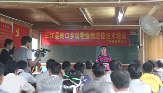 扶貧不僅僅是給農民捐款、捐物,關鍵是提高他們的自身發展能力,這樣才能從根本上解決貧困問題。針對三江縣的養殖情況和當前復雜的動物疫病形勢,特別是豬偽狂犬病呈現新的流行特點,吳健敏副所長帶領研究團隊成員舉辦了這次動物疫病防控技術培訓班。培訓班得到了廣西水產畜牧獸醫局派駐扶貧村的第一書記羅良鴻和莫有東的大力支持和積極配合。培訓班介紹了豬偽狂犬病的最新流行態勢和防控措施,還講授了雛雞養殖的關鍵技術和主要疫病防控。由于竹鼠養殖是三江縣村民用于脫貧的主要特色養殖項目,本次培訓在吳健敏副所長研究團隊的最新研究的基礎上,還介紹了目前引起竹鼠發病死亡的主要疫病和防制措施,并邀請桂林秋波竹鼠生態科技公司的梁秋波總經理講授了竹鼠養殖的技術要領。吳健敏副所長等人采用當地村民感覺更親切的“桂柳話”進行授課,一下子拉近了與村民們的距離,語言平實、易懂,村民們個個聽得聚精會神。 廣西電視臺“第一書記”攝制組當時正在三江縣拍攝產口村第一書記羅良鴻的事跡,聽說有此次技術培訓班,特意推遲一天回南寧,對培訓班進行了全程拍攝,并在培訓結束后,對吳健敏副所長進行了現場采訪。 目前吳健敏副所長的研究團隊正在承擔2013年國家農業科技成果轉化資金項目“豬偽狂犬病快速診斷及綜合防制技術應用示范”。將研究成果帶到農民身邊,促進農民增收,帶動農民致富是國家農轉項目的核心任務之一。此次動物疫病防控技術培訓班將豬偽狂犬病的最新研究成果及其它動物疫病的防控技術帶給了貧困縣的農民,是國家農轉項目與定點扶貧相結合的一次很好的嘗試。