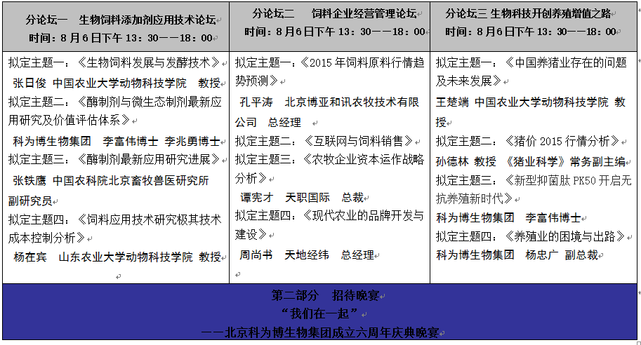 一 組織機構 主辦單位:北京市飼料工業協會 北京科為博生物集團 支持單位:中國飼料行業信息網 中國飼料工業信息網 新飼料雜志社 飼料工業雜志社 中國飼料 豬e網 畜牧人網站 愛畜牧網站 博亞和訊 中國種豬信息網 豬業科學 天地經緯 二 時間與地點 時 間:2015年8月5日-9日, 5日09:00-19:00報到。 地 點:北京友誼賓館·友誼宮。 三 擬邀請專家 王俊勛 中國農業部畜牧業司副司長 李德發 中國工程院院士 佟建明 中國農業科學院北京畜牧獸醫研究所 研究員 張日俊 中國農業大學動物科技學院 教授 楊在賓 山東農業大學動物科技學院 教授 張鐵鷹 中國農業科學院北京畜牧獸醫研究所 副研究員 王楚端 中國農業大學動物科技學院 教授 孫德林 《豬業科學》常務副主編 教授 譚憲才 天職國際 總裁 孔平濤 北京博亞和訊農牧技術有限公司 總經理 周尚書 天地經緯 總經理 四 會議日程(暫定) 五 會議費用 會議費用 1800元/人。費用包括:會刊資料費,餐費,聽課費,專家費,會議場地費,茶水費等,餐飲與住宿統一安排。 六 聯系方式 負責人:張丹丹(15810330046) 張蘭蘭(18510682559) 聯系人:秦嬌(010-89256826)于洪明(010-89207463) 郵箱:crvab@crvab.com