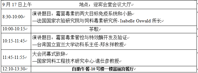 中國飼料霉菌毒素危害與防控論壇第三輪通知 近年來,隨著我國飼料和養殖行業規模化發展,市場對飼料原料的需求也大幅度增加。但由于地域、天氣等客觀原因,不可避免地會使部分玉米、豆粕等主要飼料原料產生霉變。使用已霉變的原料加工飼料,不僅會降低飼料的利用效率,產生極大浪費,更會對畜禽的健康產生危害,進而因霉菌毒素的殘留問題威脅到人類的食品安全。 針對霉菌毒素對動物生產和人類健康造成的危害,屆時我們將邀請美國、法國、英國、加拿大及國內著名行業專家,從飼料原料霉菌毒素污染狀況分析與管理、危害及檢測技術、降解及防控方法等幾個方面為大家精心策劃、細致講解,從而保障畜禽的健康生長,實現效益最大化。 以霉菌毒素研究權威專家計成教授為大會首席科學家,由中國農業大學動物科學技術學院與國家飼料工程技術研究中心聯合舉辦,中國飼料霉菌毒素危害與防控論壇,定于2015年9月16-17日,在河南省鄭州市召開,誠邀畜牧行業領導、專家學者、畜牧飼料及養殖企業共商產業發展大計,為行業搭建學習交流的專業平臺。 一、會議目的 分享國內外霉菌毒素的最新研究成果、搭建國內外技術交流與合作平臺、共享霉菌毒素風險管理方案。 二、主辦單位 中國農業大學動物科學技術學院 國家飼料工程技術研究中心 聯合主辦 河南省飼料工業協會 河南農業大學牧醫工程學院 江蘇奧邁生物科技有限公司 承辦單位: 河南億萬中元生物技術有限公司 協辦單位: 安彭利(上海)生物科技有限公司(Anpario Shanghai) 亞太興牧(北京)科技有限公司 河南穎泰農化股份有限公司 支持媒體:中國飼料行業信息網 中國飼料工業信息網 博亞和訊網 中國飼料原料信息網 中國飼料商城網 畜牧人 三、會議時間: 2015年9月15日(周二) 全天報道 2015年9月16日(周三)-17日(周四上午) 大會主題報告 注:因酒店房源比較緊張,請參會人員務必提前與會務組聯系預定,以免造成麻煩 四、會議地點: 河南省鄭州市黃河迎賓館(五星) 協議價390元/間 地址:惠濟區迎賓路1號(花園路北路與迎賓路交叉口西500米)