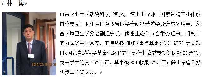 五、大會內容(暫) 六、專家介紹(部分) 七、論文征集: 1、本次研討會將面向全國征集與主題相關的學術報告、論文、調研成果,將擇優選用刊登在會刊(論文集)上作為會議資料,請擬提交論文的人員于2015年7月25日前將論文題目和摘要提交,并將電子版論文全文提交至會議通訊信箱hongs@nferc.org。2、要求論文字數不超過6000字,文件格式為word文檔。具體內容包括:論文題目、作者姓名、工作單位、通訊地址、郵政編碼、電話、論文摘要、關鍵詞、正文、主要參考文獻。 八、收費標準: 本次會議費用定在1200元/人(含報名費、學習費、資料費、餐飲費等),住宿酒店統一安排,費用自理(優惠:5人(含)以上集體報名,可享1000元/人)。 九、聯系方式: 中國飼料霉菌毒素危害與防控論壇-會議秘書處 地址:中國農業大學西校區動物科學技術學院 電話:洪汕(13811101207) 趙麗紅(13426191325) 電郵:hongs@nferc.org 匯款單位:北京龍科方舟生物工程技術有限公司 開戶銀行:中國農業銀行北京分行圓西路支行 帳 號: 11052701040002032