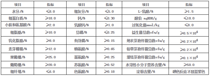 【產品成分】 玉米、碎米、豆粕、魚溶漿、復合油等五種飼糧的益生菌發酵產物,富含酵母蛋白、乳化脂肪、麥芽糊精、葡萄糖、果糖、小肽、乳酸、共軛亞油酸、酵母硒、益生菌、低聚糖、生物酶、乳酸鈣、酵香素、酵甜素和未明促生長因子等養分。 【理化特性】 ● 直接飼喂:五糧肽為黃色或褐黃色粉狀物,系5種優質飼糧發酵產物,營養全面、平衡,蛋白質在12%以上,可以直接與全價料交互飼喂,也可以額外添加飼喂。 ● 聞嘗試驗:五糧肽中富含乳化脂肪、麥芽糊精、葡萄糖、果糖、乳酸、酵香素和酵甜素,聞著香,嘗著甜,大部分養分入口即化,具有酸甜、薯香、奶油和發酵味道。 ● 溶水試驗:抓一把五糧肽放在茶杯或燒杯中,65%以上養分可以溶解到水中,說明可溶性小分子營養多,脂肪、蛋白質和淀粉都降解成為小分子營養物質,乳化脂肪、麥芽糊精、葡萄糖、果糖、小肽、乳酸、乳酸鈣、低聚糖和益生菌含量多。 ● 碘色反應:五糧肽溶液中滴入碘液不變色,說明不含淀粉,淀粉全部變成麥芽糊精、葡萄糖、果糖、乳酸和共軛亞油酸,吸收肯定好。 ● 產品標準:五糧泰公司制定有嚴格操作程序和五糧肽產品質量標準,乳化脂肪、麥芽糊精、葡萄糖、果糖、小肽和乳酸等養分含量均可以測定。 【質量標準】 表5 谷物、豆粕和油脂發酵飼料主要營養成分表 【使用方法】 ● 直接飼喂:均勻混入維生素、藥物和鈣磷等礦物元素養分后直接飼喂。 ● 交互飼喂:上午飼喂五糧肽,下午飼喂全價料。 ● 制料飼喂:按10-30%比例配制全價飼料,制成顆粒料或粉料飼喂。 ● 額外飼喂:按10-30%添加比例,額外添加全價料中飼喂。 【產品存儲】 ● 避光、陰涼、干燥處保存。 ● 切勿多層堆放,以防止堆壓結塊。 【包裝規格】 40千克/袋 【保 質 期】 4月份至9月份 60天;10月份至次年3月份90天 |