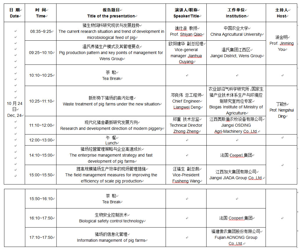 2015年江西省豬業博覽會暨高效養豬高峰論壇 中國•南昌 2015年11月3-5日 主辦單位:江西省養豬專業委員會 江西省生豬產業技術體系 支持單位:江西農業大學動物科技學院 承辦單位:鄭州向陽花文化傳播有限公司 冠名單位:南昌傲農生物科技有限公司 協辦單位:法國Cooperl集團 傲農集團 上海紐崔特飼料科技有限公司 江西奧斯盾農牧設備有限公司 湖南佳和農牧有限公司 湖南天心種業有限公司 戰略合作:微養豬(微信) 中國養豬網 支持媒體:《養豬產業通訊》 優豬網 豬e網 愛豬網 豬場動力網 《中國豬業》 《國外畜牧學-豬與禽》 《豬業科學》 微養豬 畜牧人網站 獎品提供:誠招中…… 活動主題:新常態 新科技 新思維 高效益 會議服務 一、會議地址 1、會議賓館: 南昌天沐溫泉大酒店(南昌市青云譜區金沙大道北口) 2、聯系人:馬偉真(15713717888) 二、報到服務 1、報到處設在天沐溫泉大酒店一樓大廳 2、參會代表辦理報到手續、取會議資料、辦理入住手續 三、住宿服務 1、天沐溫泉大酒店訂房熱線:0791- 87605678;傳真:0791- 87605566 2、會務組設在 號房間;聯系電話:0791- 8758777轉 房間號 四、用餐服務 1、早餐:憑房卡在?樓自助餐廳用餐。 2、中餐、晚餐:憑會議餐券用餐,具體時間、地點如下: 五、交通服務 1、到達南昌昌北國際機場的參會人員可自己乘坐機場大巴或出租車到南昌市“天沐溫泉大酒店”,全程時間約50分鐘。 3、到達南昌火車站的參會人員可乘坐出租車直達天沐溫泉大酒店(地址:南昌市青云譜區金沙大道北口),時間約40分鐘。 大會報告