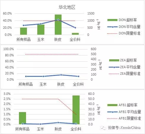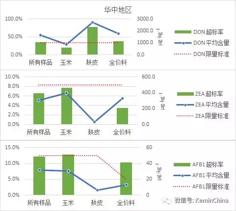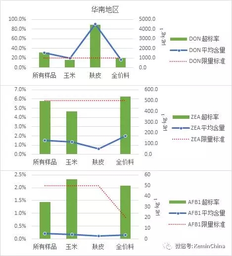 2016年,從北京、福建、安徽、山東、廣東、湖南等20個省市收集839份飼料及飼料原料,檢測了其中對畜禽生產(chǎn)影響較大的黃曲霉毒素B1、玉米赤霉烯酮和嘔吐毒素含量。結(jié)果顯示,黃曲霉毒素B1普遍污染較輕,玉米胚芽粕有個別樣品超標;蛋白粉和玉米胚芽粕中玉米赤霉烯酮污染較為嚴重;各類樣品嘔吐毒素污染水平都較高,以DDGS、麩皮、面粉、小麥污染最為嚴重。 將這20省市分為華南、華北、華東、華中等區(qū)域,我們對其結(jié)果進行了統(tǒng)計和分析,不同地區(qū)3種霉菌毒素污染情況結(jié)果如下: 華北地區(qū) 華北地區(qū)飼料及飼料原料共82份樣品中,麩皮樣品嘔吐毒素污染嚴重,超標率達57.1%,平均含量1066.8μg/kg,玉米中嘔吐毒素平均含量為777.2μg/kg,超標率為28.9%;全價料有個別樣品出現(xiàn)黃曲霉毒素超標的情況,但污染情況較輕;飼料及各類飼料原料中玉米赤霉烯酮均無超標(圖1)。 圖1 華北地區(qū)3種霉菌毒素污染情況 華東地區(qū) 華東地區(qū)共檢測飼料及飼料原料405份,其中嘔吐毒素污染最為嚴重,全價料和玉米中3種霉菌毒素均有個別樣品超標,且嘔吐毒素超標的樣品較多,玉米赤霉烯酮和黃曲霉毒素B1污染程度較為輕微;麩皮嘔吐毒素超標非常嚴重,超標率高達75%,且樣品嘔吐毒素平均含量達到2626μg/kg,麩皮中玉米赤霉烯酮和黃曲霉毒素B1沒有超標且污染程度輕微(圖2)。 圖2 華東地區(qū)3種霉菌毒素污染情況 華南地區(qū) 華南地區(qū)檢測飼料及飼料原料樣品共147份,各類樣品受嘔吐毒素污染較為嚴重,其次為玉米赤霉烯酮。全價料和玉米中嘔吐毒素超標率均在20%左右,平均含量在1000μg/kg左右,污染情況相對嚴重,玉米赤霉烯酮和黃曲霉毒素B1的超標率均在5%左右,且平均含量較低,污染程度輕微;麩皮嘔吐毒素超標率高達88.9%,平均含量4524.5μg/kg,污染情況非常嚴重(圖3)。 圖3華南地區(qū)3種霉菌毒素污染情況 華中地區(qū) 華中地區(qū)檢測飼料及飼料原料共149份,其中嘔吐毒素污染最為嚴重,其次為黃曲霉毒素B1。全價料中嘔吐毒素超標率為37.1%,平均含量為1755.5μg/kg,黃曲霉毒素B1超標率為10%;玉米中嘔吐毒素超標率為20.5%,平均含量為878.6μg/kg,黃曲霉毒素B1超標率為12.8%,平均含量30.6μg/kg;麩皮主要受嘔吐毒素污染,超標率76.9%,平均含量達2701.4μg/kg(圖4)。 圖4 華中地區(qū)3種霉菌毒素污染情況 小結(jié) 2016年飼料及飼料原料受嘔吐毒素污染最為嚴重,且樣品污染水平主要以中度污染及嚴重污染為主;其次為玉米赤霉烯酮,除蛋白粉和玉米胚芽粕污染程度較為嚴重外,其他樣品主要受到輕微污染;黃曲霉毒素B1的污染程度普遍較輕。 2016年霉菌毒素污染水平呈現(xiàn)出區(qū)域差異,各地區(qū)樣品主要以嘔吐毒素污染為主,且麩皮為重點污染對象;其中華南地區(qū)的污染水平最為嚴重,其次為華東和華中地區(qū),華北地區(qū)污染情況相對較輕;雖然黃曲霉毒素B1整體的污染水平不高,但華中地區(qū)樣品的黃曲霉毒素B1超標率高于其他地區(qū)。 注:文章截取自建明工業(yè)黃俊恒、黃廣明《2016全國20省市飼料及飼料原料霉菌毒素污染狀況分析》 |