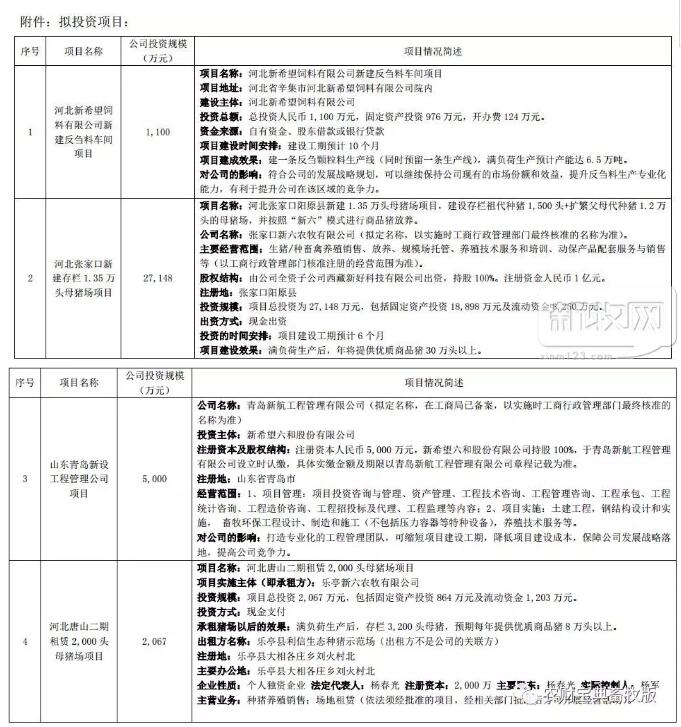 近日,新希望六和股份有限公司發(fā)布公告,公司通過了河北張家口新建存欄 1.35 萬頭母豬場等四個項目,總投資約3.5億元,布局豬場、飼料等市場。其中2.9億元用于建設豬場,建成后可年提供斷奶仔豬38萬頭以上。 新希望投3.5億元再布局飼料、養(yǎng)豬! 巨潮資訊 據(jù)巨潮資訊稱,新希望六和股份有限公司(以下簡稱“公司”)第七屆董事會第二十四次會議于 2018 年 2 月 13 日以通訊表決方式召開。審議并通過了如下議案: (一)審議并通過了“關(guān)于河北新希望飼料有限公司新建反芻料車間項目的議案” 為了促進公司的反芻飼料加工、養(yǎng)殖業(yè)務的發(fā)展,優(yōu)化飼料業(yè)務產(chǎn)品結(jié)構(gòu),提升專業(yè)化生產(chǎn)能力,經(jīng)調(diào)研論證,擬在河北新希望飼料有限公司新建反芻料車間,項目投資總額擬為 1,100 萬元( 具體情況詳見附件)。 (二)審議并通過了“關(guān)于河北張家口新建存欄 1.35 萬頭母豬場項目的議案” 為了充分發(fā)揮環(huán)渤海區(qū)綜合優(yōu)勢,根據(jù)公司生豬產(chǎn)業(yè)發(fā)展戰(zhàn)略,公司擬在河北省張家口市新建存欄祖代種豬 1,500 頭+擴繁父母代種豬 1.2 萬頭的母豬場。項目滿負荷生產(chǎn)后,年可提供斷奶仔豬 30 萬頭以上。本項目占地為 1,200 畝,總投資 27,148 萬元,包括固定資產(chǎn)投資 18,898 萬元及流動資金 8,250 萬元( 具體情況詳見附件)。 (三)審議并通過了“關(guān)于山東青島新設工程管理公司項目的議案” 為實施好公司發(fā)展戰(zhàn)略,在提升公司競爭力的同時抓住近年來農(nóng)業(yè)生產(chǎn)供給側(cè)結(jié)構(gòu)性改革的機遇,特別是規(guī)模化、現(xiàn)代化養(yǎng)殖大發(fā)展中的農(nóng)機設備、養(yǎng)殖設施、食品加工裝備技術(shù)升級的市場機會, 以及支持公司各方面投資項目建設,公司準備打造專業(yè)化的工程建設團隊,在山東省青島市注冊成立一家工程管理公司,注冊資金 5,000 萬元(具體情況詳見附件)。 (四)審議并通過了“關(guān)于河北唐山二期租賃 2,000 頭母豬場項目的議案” 按照公司生豬產(chǎn)業(yè)發(fā)展規(guī)劃,公司擬在河北省唐山市樂亭縣原租賃豬場項目中(一期項目已于 2016 年 6 月 29 日經(jīng)公司第七屆董事會第三次會議審議通過,項目投資金額為 1,000 萬元,一期租賃豬場容納父母代 1,200 頭)擴大租賃父母代種豬 2,000 頭。項目滿負荷生產(chǎn)后,年可提供斷奶仔豬 8 萬頭以上。本項目占地 160 畝,總投資擬為2,067 萬元,包括固定資產(chǎn)投資 864 萬元及流動資金 1,203 萬元( 具體情況詳見附件)。 |