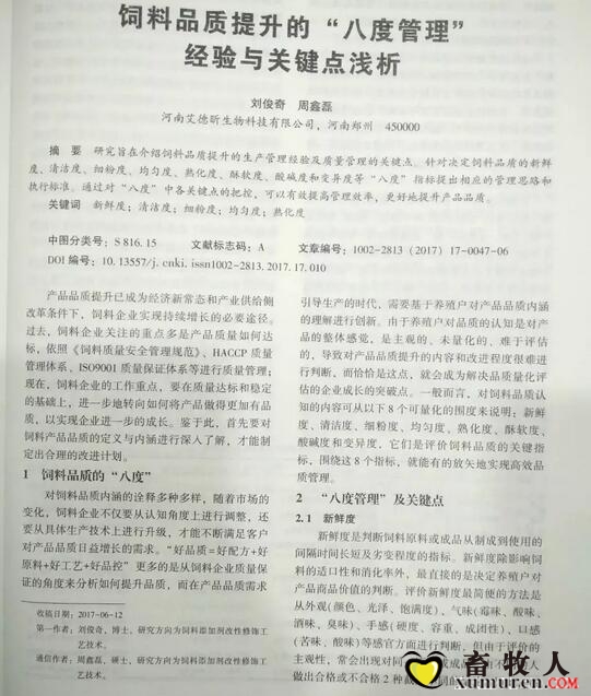 正文摘要:作者:劉俊奇 周鑫磊 轉自:激活飼界微信公眾號 所謂“八度”是指飼料原料或成品的新鮮度、清潔度、細粉度、均勻度、熟化度、酥軟度、酸堿度和變異度。“八度 ... |