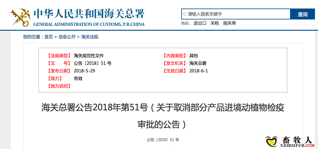 海關總署公告2018年第51號(關于取消部分產品進境動植物檢疫審批的公告)公告〔2018〕51 號 根據《進境動植物檢疫審批管理辦法》(質檢總局令第25號公布,質檢總局令第170號、海關總署令第238號修改),經風險評估, ...