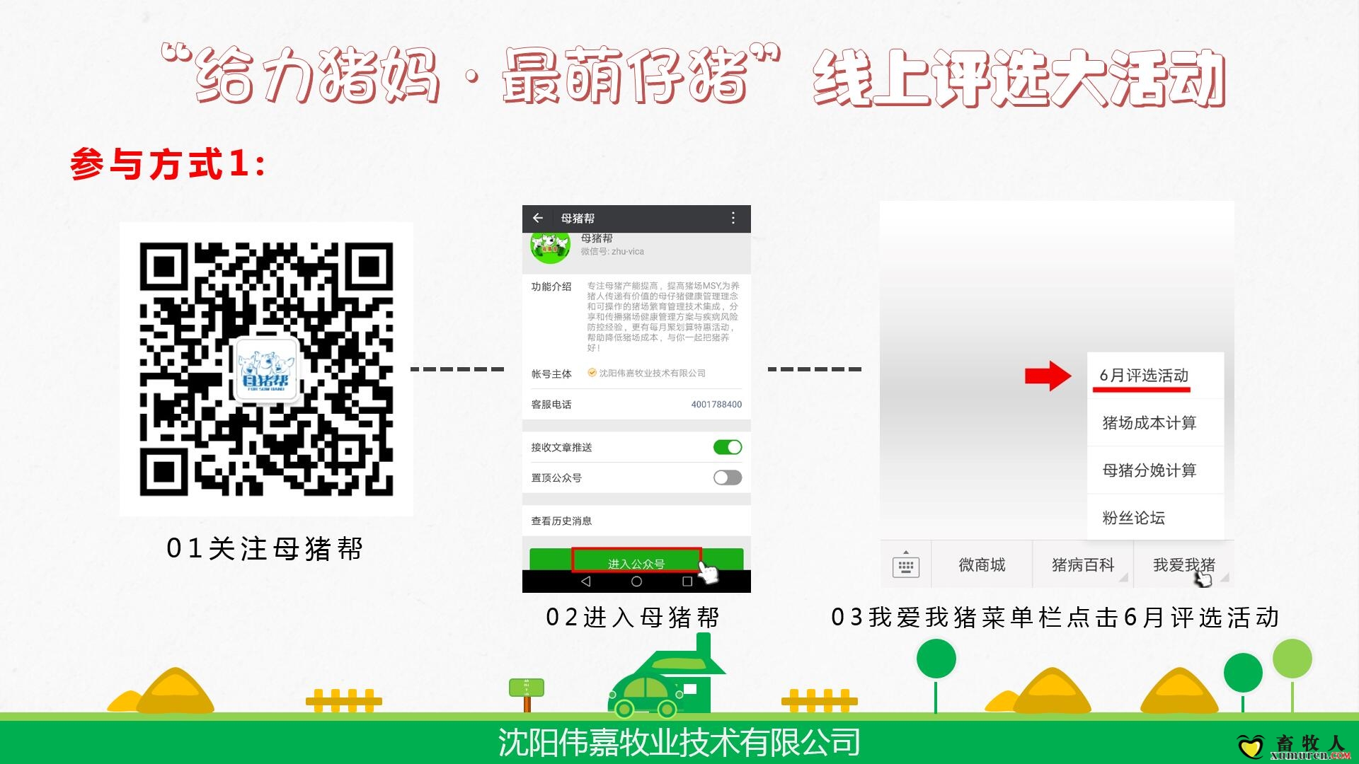 "給力豬媽·最萌仔豬"線上評選大活動 活動時間:2018年6月1日-6月30日 簡單三步,輕松參與! ①關注母豬幫 ②點擊我愛我豬菜單下的:6月評選活動 ③進入活動主頁面,點擊我也要參加 通過活動發現更多母豬飼養明星和能 ...