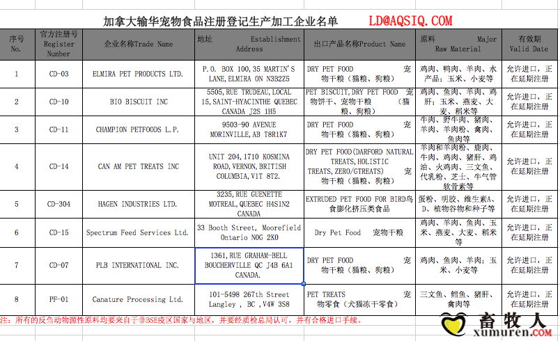 加拿大8家輸華寵物食品生產加工注冊企業名單公布 海關總署官網公布加拿大輸華寵物食品生產加工注冊企業名單。 加拿大輸華寵物食品生產加工注冊企業名單 序號 No.官方注冊號Register Number ...