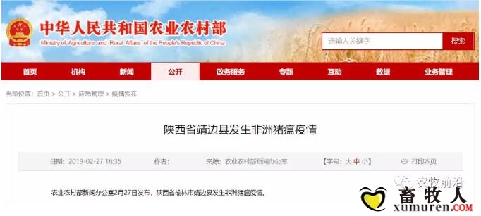 正文摘要:陜西萬頭豬場(chǎng)發(fā)生疫情 農(nóng)業(yè)農(nóng)村部新聞辦公室2月27日發(fā)布,陜西省榆林市靖邊縣發(fā)生非洲豬瘟疫情。 2月27日,農(nóng)業(yè)農(nóng)村部接到中國(guó)動(dòng)物疫病預(yù)防控制中心報(bào)告,經(jīng)陜西省動(dòng)物疫病預(yù)防控制中心確診,靖邊縣一養(yǎng)殖場(chǎng)發(fā)生非 ... |