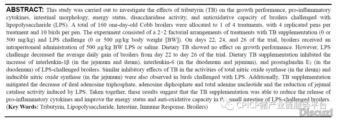 三丁酸甘油酯對受LPS刺激肉雞腸道能量狀態、抗氧化能力和免疫反應的影響 Jiaolong Li, Yongqing Hou等湖北省動物營養與飼料安全合作創新中心武漢輕工大學湖北省動物營養與飼料科學重點實驗室 研究的主要目的: ...