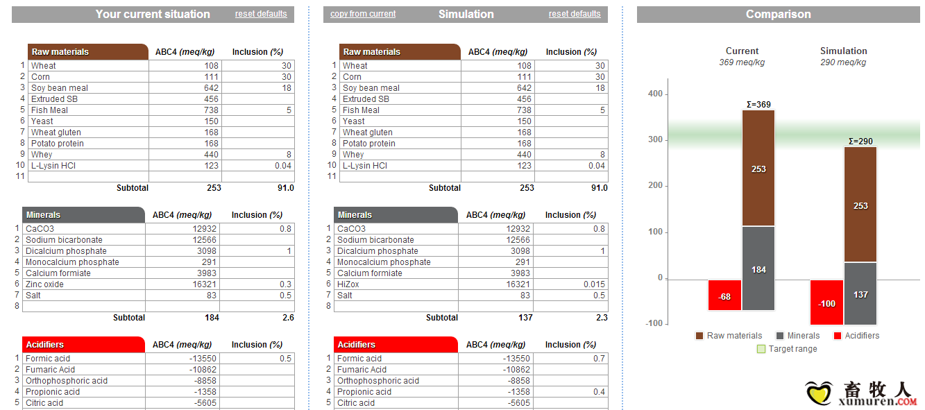 有一篇文章專門介紹了一下這個 翻譯軟件翻譯的: 氧化鋅緩沖有機酸在小豬 緩沖能力是經常被忽視的一個重要方面時使用“常規”成分,如氧化鋅。2014年,歐盟法規更新飼料制造業,使仔豬飼料中使用普通氧化鋅徒勞無功。 從個人的角度來看,我是使用普通氧化鋅在2 - 3公斤每公噸小豬飼料,只因為一個經銷商認為這是市場的需要。 但是,我們決定是時候繼續前進到符合現代不同的東西。 我們選擇的新來源會加強氧化鋅(基本上,高度多孔氧化鋅),可以使用在低水平,所以,在歐盟法規,而且還引起有利于平衡腸道微生物區系的影響,但是,這是另一個故事。 在更換過程中,我是編輯本文由詹尼·Karvelis膳食緩沖能力,也出現在這個問題上的一篇文章豬國際。 我的眼睛被在最后兩行表的那篇文章:氧化鋅和有機酸。 不僅我的興趣了,因為我用氧化鋅在較高水平,但我也相信使用有機酸non-medicated提要,使用10公斤/度量的語氣,或更多的在某些情況下。 但是,再一次,我跑題了。 我驚呆了,當我意識到通過使用正常水平的氧化鋅(2 - 3公斤/噸),我幾乎是消滅任何pH值降低的效果我添加有機酸。 我已經夠幸福了,我一直在藥用飼料使用有機酸,以免改變最終的pH值的飼料,但這些non-medicated提要依靠控制致病菌的有機酸。 酸結合能力 大約在同一時間,我收到一封郵件關于一個新的在線工具提供計算酸結合能力的飼料相比,使用一個相當大的數據庫。 這是網站地址:http://animine.eu/ABC4-calculator。 因此,對于自己的教育,為了測試這個新工具,我制定了一個非常簡單的飲食基于普通氧化鋅和同一個替代氧化鋅。 我用檸檬酸作為參考酸(圖1)。 這種酸,使用時在10公斤/噸)減少了酸緩沖能力參考pH值4(ABC4)56-meq /公斤飼料。 通過切換氧化鋅來源,緩沖能力降低了48-meq /公斤飼料。 換句話說,普通氧化鋅緩沖包含相對較高水平的檸檬酸。 當然,我知道他們的個人影響,但這是我第一次在實際條件下組合這些信息。 如下我的小豬飼料產品已經推薦的最大ABC4,我從未注意個別成分的影響。 有趣的是,飲食我使用這個測試的例子(圖1)恰好高于推薦最大ABC4(350毫克當量/公斤),而用low-inclusion氧化鋅,ABC4降至一個可接受的水平。 這可以是一個巨大的商業條件下幫助ABC4時很難控制,特別是在飲食中含有高水平的奶制品和魚餐。 現在,它仍然是獲得一些有用的觀察從這個經驗以供將來參考: