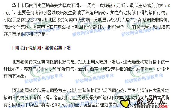 第42周(10月11日-10月17日)據新牧網監測價格可以看出,上周全國生豬平均價格下滑0.27元/斤,周六全國生豬平均價格為8.32元/斤,全國生豬平均價格進入快速下滑通道。10月17日新牧網豬價指數為130.89,一周內豬 ...