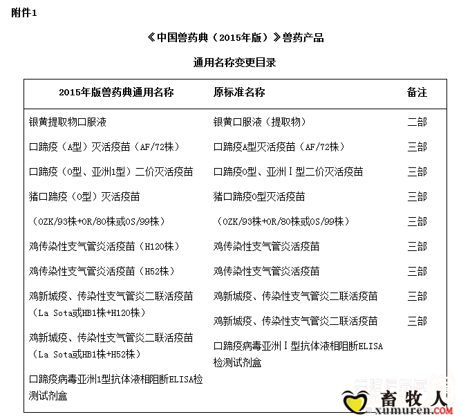 2016年8月23日,農業部發布《中華人民共和國獸藥典(2015年版)》實施公告。共收錄1634個品種,其中化學藥品752個,中獸藥751個,獸用生物制品131個,自2016年11月15日起施行。詳細內容請參照:農業部公告第243 ...