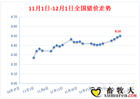 12月第一天豬價突破8.5!全國外三元豬價繼續穩中上漲。黑龍江漲跌互現,部分屠企下調結算價0.1元/公斤,主流價17-17.6元/公斤;吉、遼穩中漲0.1-0.2元/公斤,主流價16.8-17.5元/公斤;京津趨穩,主流價16.8-17.3元/公 ...