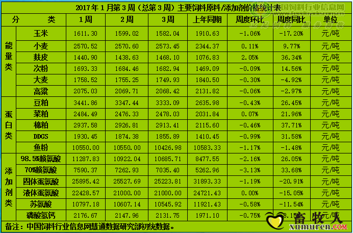 正文摘要:一,主要飼料原料及添加劑市場行情概述: 2017年1月第3周(2017年1月16日-22日總第3周),本周國內(nèi)飼料原料及添加劑交易量明顯下降,主要飼料原料市場行情的偏弱大趨勢未能改善,除小麥、麩皮、菜粕周度均價 ... |