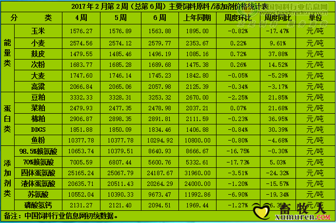 一,主要飼料原料及添加劑市場行情概述: 2017年2月第2周(2017年2月6日-12日總第6周),本周國內飼料原料總體供應充足,需求市場偏弱。市場行情整體弱勢格局未改,大多數產品行情延續跌勢,尤其是賴氨酸周 ...
