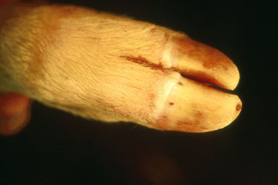 蹄踵部紅腫,蹄叉部潰瘍,蹄殼開始脫落