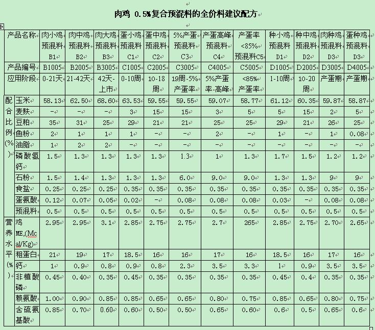 下載地址:肉雞 0.5%復合預混料的全價料配方