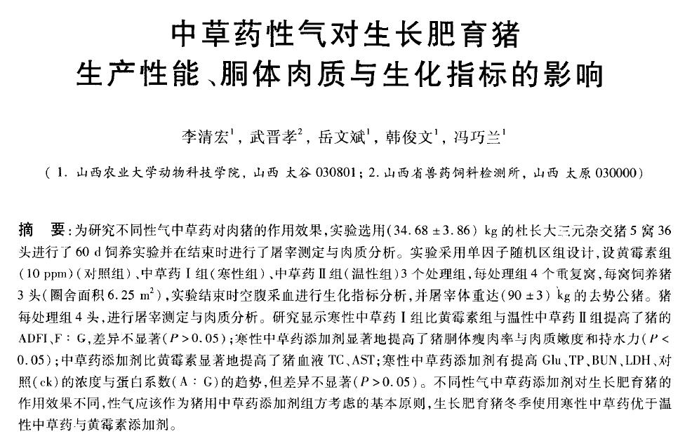 內容介紹:中草藥性氣對生長肥育豬生產性能、胴體肉質與生化指標的影響