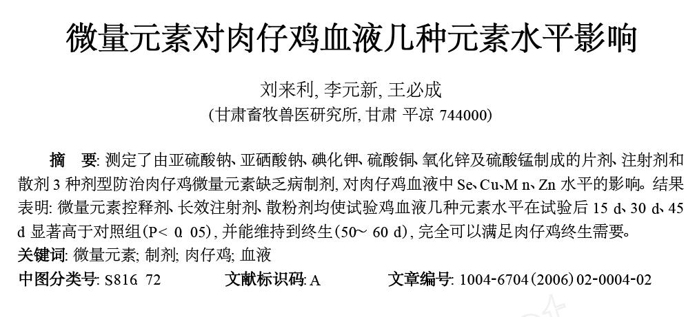 微量元素對肉仔雞血液幾種元素水平影響 |