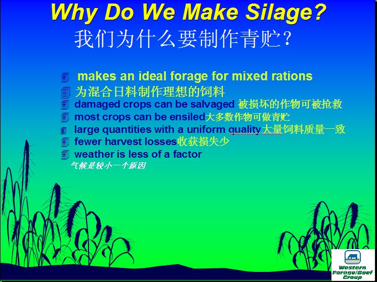 內容介紹:加拿大飼草(肉牛)研究中心對華合作項目的資料(原版英文ppt,全部中英文對照,一共123頁)。 資料即涉及青貯的基礎知識,同樣也介紹國際青貯先進經驗,并針對中國的實際存在的情況提出建議。 其中,還包括大量豐富的國外青貯方面的圖片(國外青貯窖、青貯塔、袋裝青貯、收割機械等)。