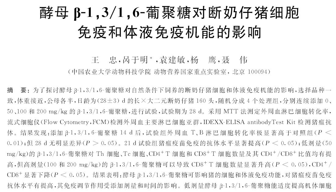 [酵母細胞壁多糖] 酵母葡聚糖對斷奶仔細胞免疫和體液免疫機能的影響