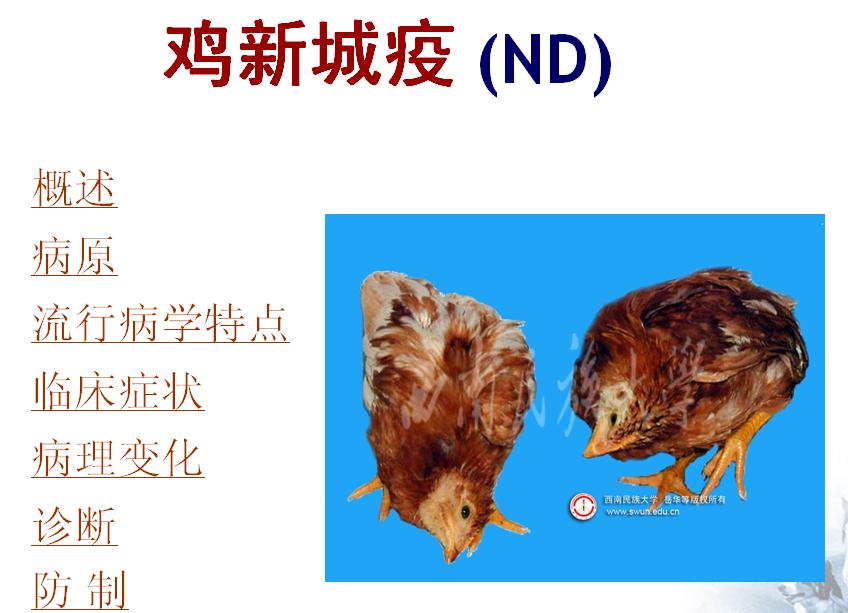內容介紹:雞、鴨、鵝疾病的診斷、預防、治療和研究進展。大學課程課件。理論學習者和一線操作人員均適合的學習資料。