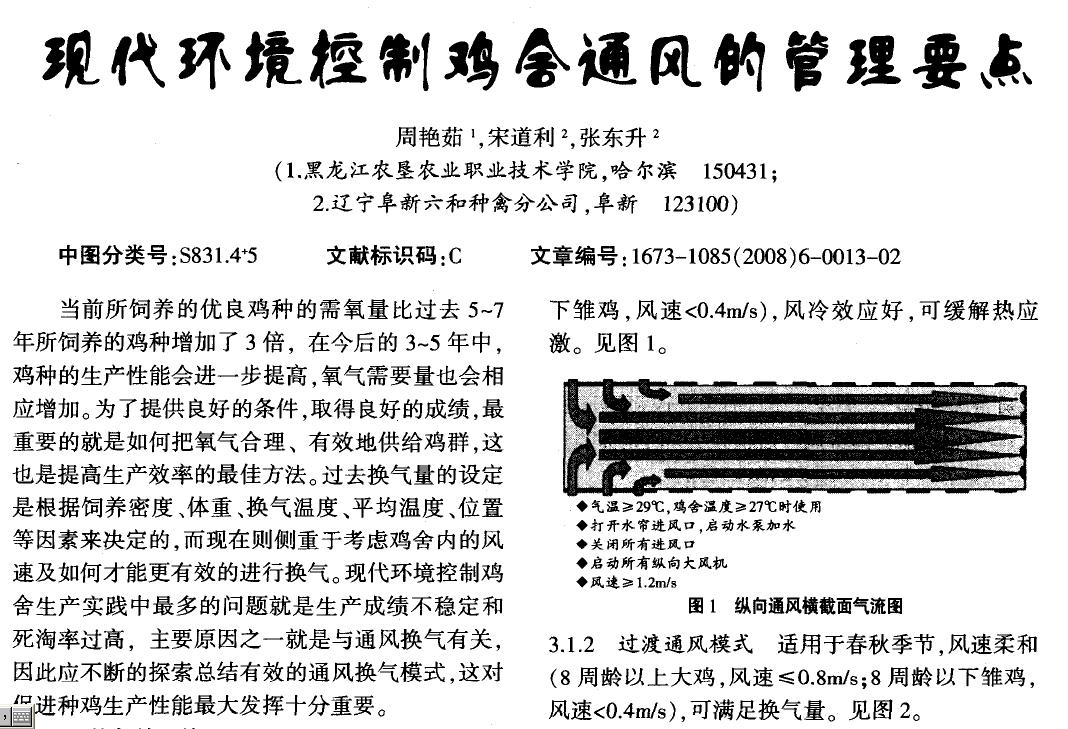 內容介紹:本文為《 家禽科學poultry science》中的一篇文章。當前所飼養的優良雞種的需氧量比過去5~7年所飼養的雞種增加了3倍。在今后的3~5年中。雞種的生產性能會進一步提高。氧氣需要量也會相應增加。為了提供良好的條件,取得良好的成績,最重要的就是如何把氧氣合理、有效地供給雞群,這也是提高生產效率的最佳方法。過去換氣量的設定是根據飼養密度、體重、換氣溫度、平均溫度、位置等因素來決定的。而現在則側重于考慮雞舍內的風速及如何才能更有效的進行換氣。現代環境控制雞舍生產實踐中最多的問題就是生產成績不穩定和死淘率過高。主要原因之一就是與通風換氣有關,因此應不斷的探索總結有效的通風換氣模式。這對促進種雞生產性能最大發揮十分重要下載地址: 現代環境控制雞舍通風的管理要點