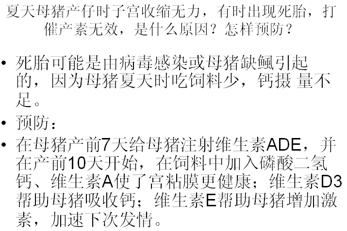 內容介紹:夏天母豬產仔時子宮收縮無力,有時出現死胎,打催產素無效,是什么原因?怎樣預防?