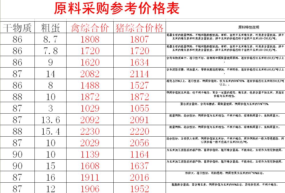 內容介紹:一個原料價格參考價格表,以玉米與小麥為基礎設定的