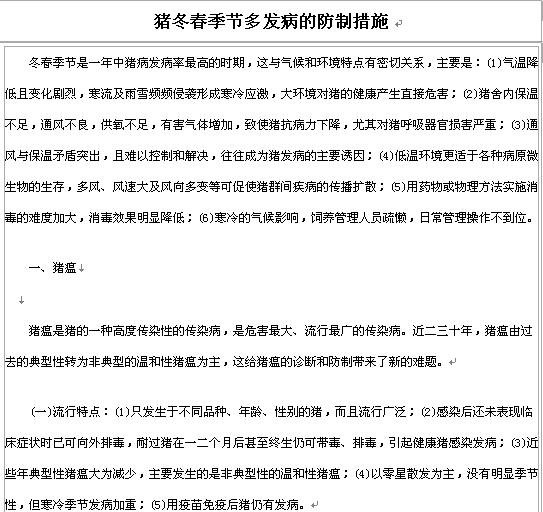 內容介紹: 冬春季節是一年中豬病發病率最高的時期,這與氣候和環境特點有密切關系,主要是:(1)氣溫降低且變化劇烈,寒流及雨雪頻頻侵襲形成寒冷應激,大環境對豬的健康產生直接危害;(2)豬舍內保溫不足,通風不良,供氧不足,有害氣體增加,致使豬抗病力下降,尤其對豬呼吸器官損害嚴重;(3)通風與保溫矛盾突出,且難以控制和解決,往往成為豬發病的主要誘因;(4)低溫環境更適于各種病原微生物的生存,多風、風速大及風向多變等可促使豬群間疾病的傳播擴散;(5)用藥物或物理方法實施消毒的難度加大,消毒效果明顯降低;(6)寒冷的氣候影響,飼養管理人員疏懶,日常管理操作不到位下載地址: 豬冬春季節多發病的防制措施