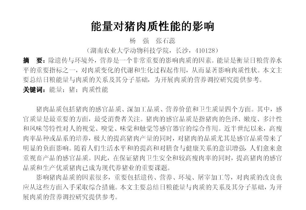 內容介紹:本文總結了能量對瘦肉率、脂肪率、肌間脂肪含量、系水力、多汁性、肉色、嫩度等的影響及其相關的分子作用機理