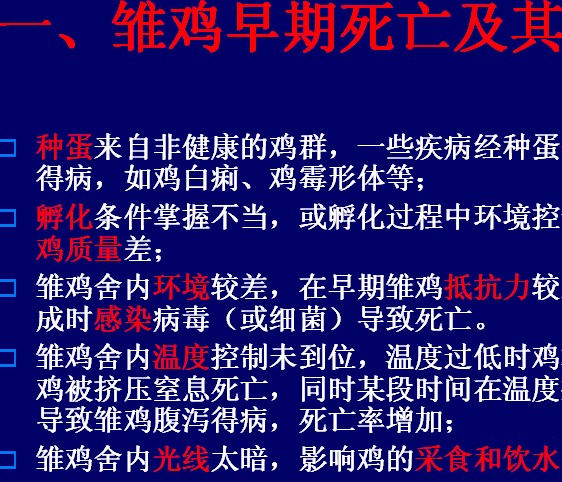 內容介紹:一、雛雞早期死亡及其原因? 二、雞群發育不齊的原因分析 三、雞體重低于標準體重的原因分析 四、蛋雞產蛋率上升緩慢的可能原因 五、產蛋雞為什么沒有產蛋高峰? 六、產蛋突然下降的可能原因分析 七、蛋重(個)偏小的原因 八、蛋殼顏色變淺的原因
